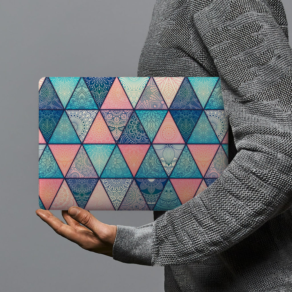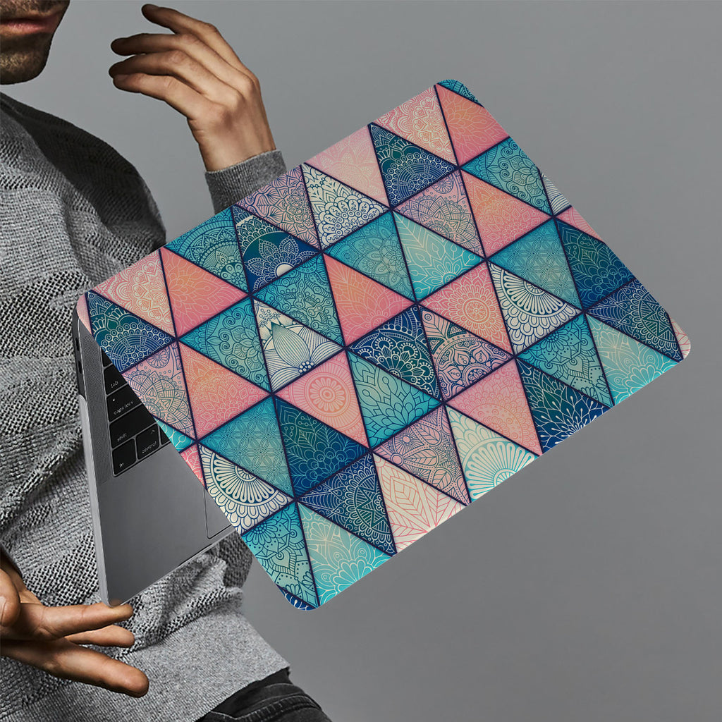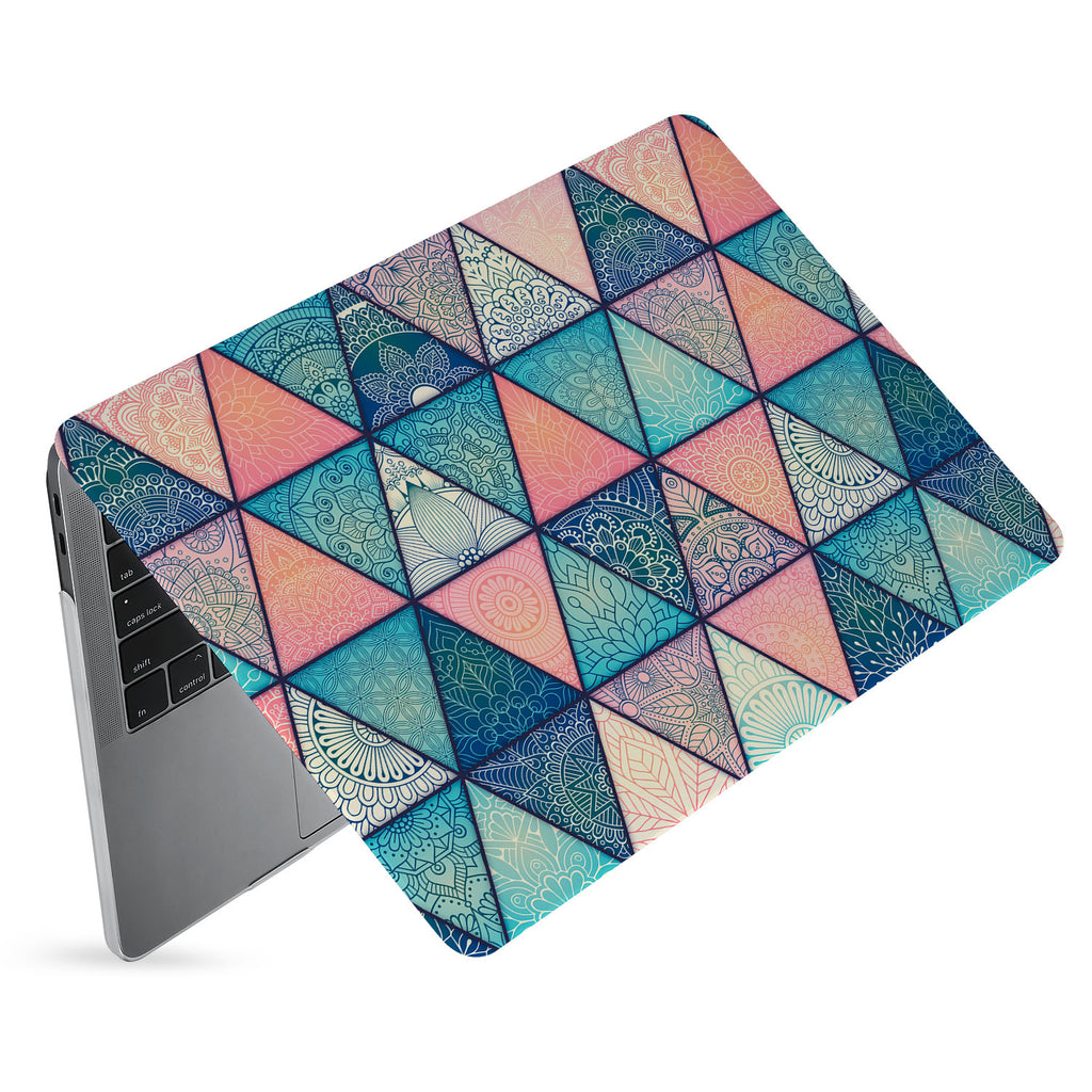 " This incredible Personalized Macbook Case will put you in a trance! Perfectly clean-cut triangles cover the case, each one filled with an intricate Mandala pattern resembling a henna tattoo. The color palette is a bold but feminine mix of pinks and blues. This design will appeal to boho chicks, and yogis alike. "